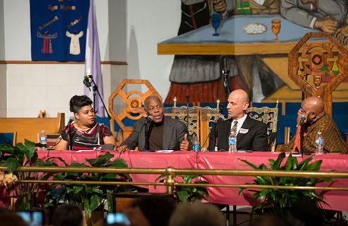 Shallal was speaking at a Baptist church, beneath a thirty-foot mural of the Last Supper that depicted the disciples as civil rights leaders, including Rosa Parks and Harriet Tubman. “Everything that happens in this city has a race overlay,” Shallal told the audience. “Whether you’re running for mayor, whether you’re talking about schools, whether you’re talking about gentrification, whether you’re talking about affordable housing, whether you’re talking about public safety, race is at the front and center.” Later, Shallal told me that he thought talking about race was an “essential” first step in taking on what he sees as the city’s most pressing issues, namely housing, education and economic development.