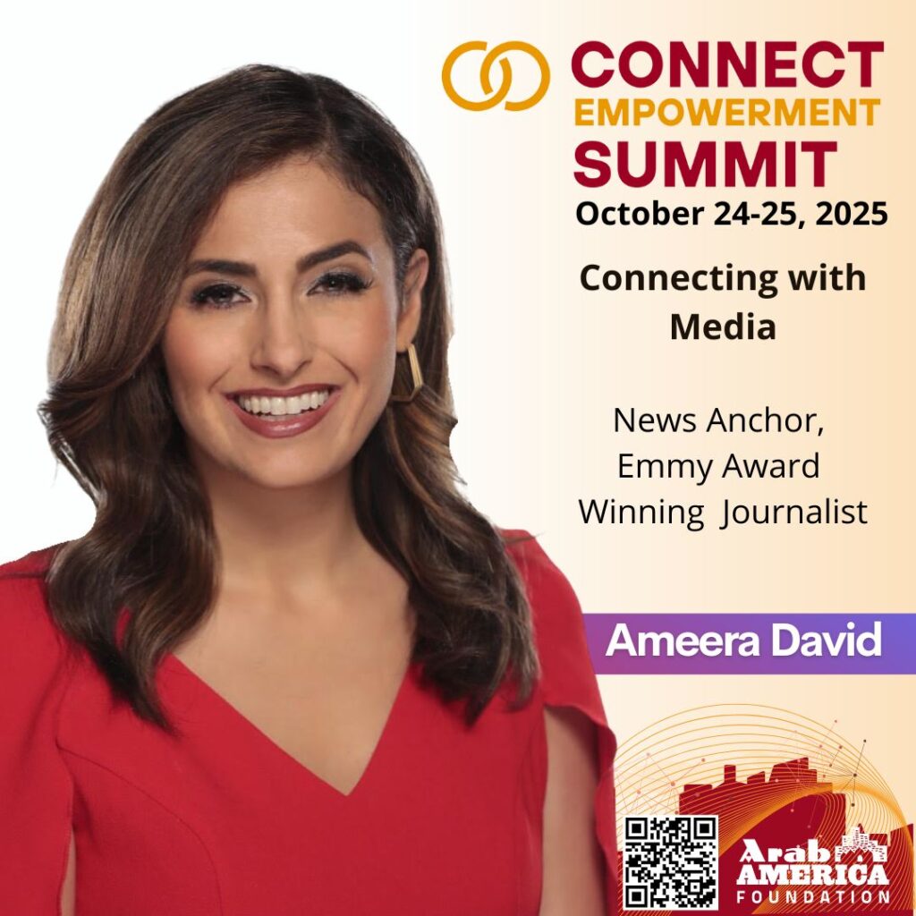 Ameera David is an Emmy Award-winning journalist and former anchor at Sinclair Media in Washington, DC and WXYZ-TV in Detroit. Ameera’s work highlights pressing issues in politics, international affairs, and the economy, earning her recognition for thoughtful and impactful storytelling. A proud Arab American, she is dedicated to amplifying diverse voices and fostering greater understanding through journalism. At the CONNECT Arab America Empowerment Summit, she brings her expertise, passion, and commitment to community empowerment.