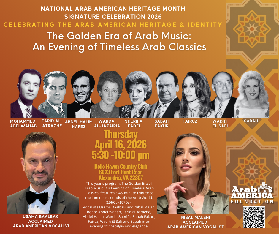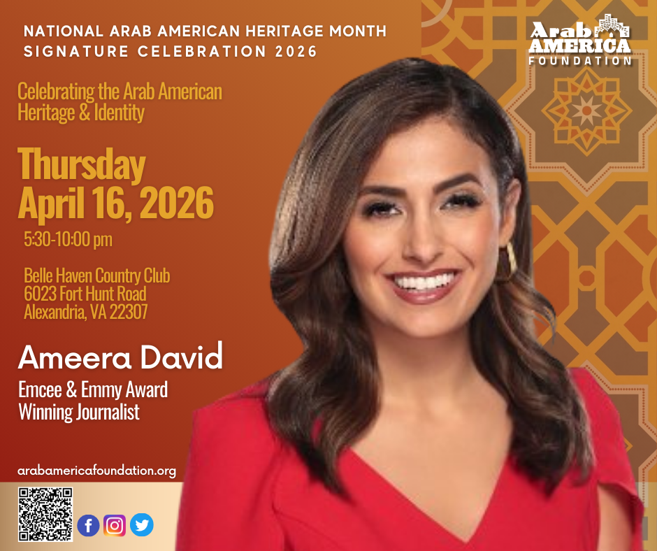 (WASHINGTON, DC) March 4, 2026 — On Thursday, April 16, 2026, the Arab America Foundation (AAF) will present its Ninth Annual National Arab American Heritage Month Signature Event at Belle Haven Country Club, 6023 Fort Hunt Road, Alexandria, VA. This year’s theme, “Many Voices, One Community,” celebrates the diversity of Arab American identities while affirming the shared values that unite us.