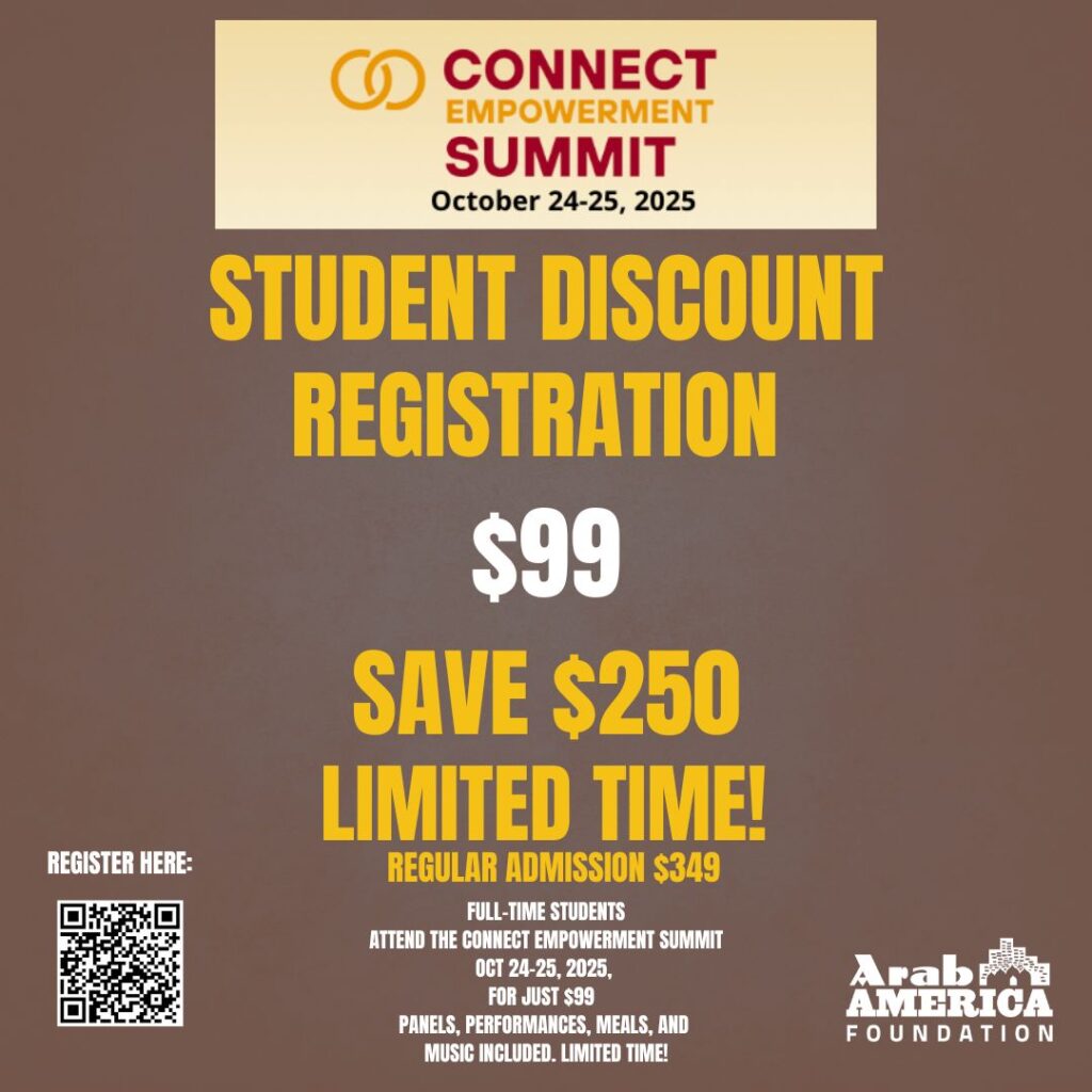(WASHINGTON, D.C., October 1, 2025) The Arab America Foundation is pleased to announce a special student rate for the CONNECT Arab America Empowerment Summit, taking place on October 24–25 at the Teaneck Marriott at Glenpointe in Teaneck, NJ.
