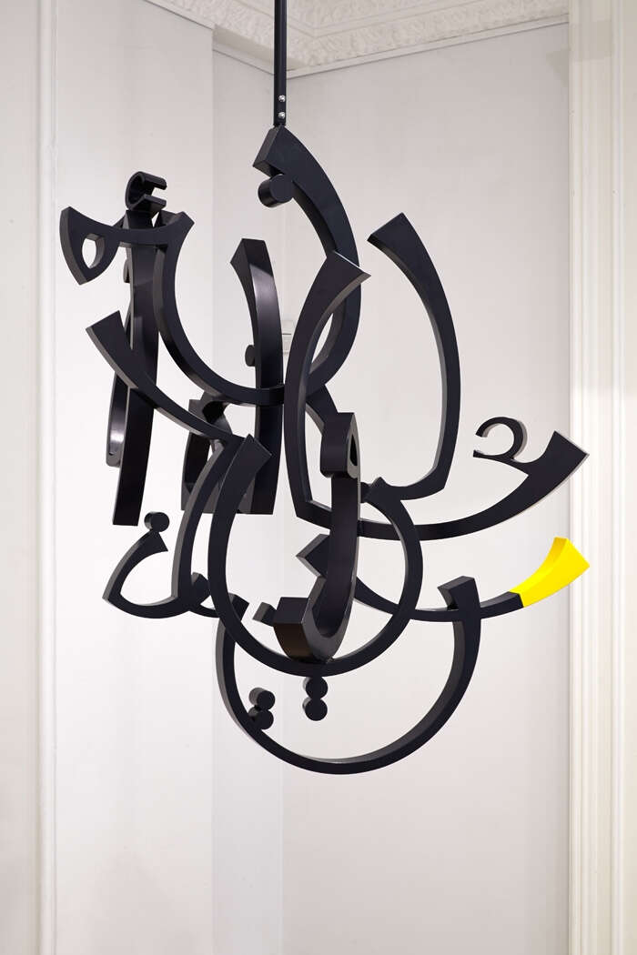 The London-based spatial designer Dia Batal uses Arabic calligraphy as a vehicle to explore notions of identity, memory and migration. In her latest exhibition at Mosaic Rooms, a non-profit center of contemporary Arab culture and art, her stylized script is brought to life through various mediums, from silkscreen prints, to embroidery and works in metal.