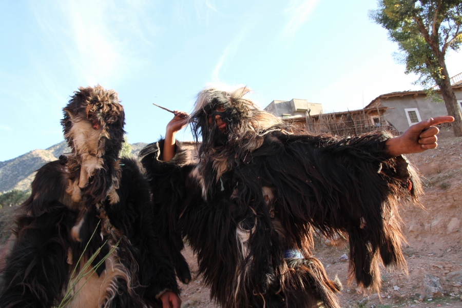 In Amazigh cities like Agadir and surrounding towns in the Souss, High and Anti Atlas regions, Boujloud typically begins on the second day of Eid and can last several days. Groups of young men typically prepare costumes together. Some attach sheep hooves to their hands. Others carry goat legs or olivewood sticks. Today, many participants tend to exaggerate the costumes to create a greater spectacle for the public.
