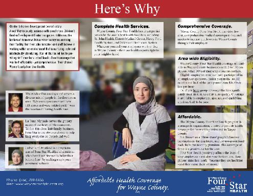 Wayne County Four Star is available exclusively to Wayne County small businesses with 2 – 100 employees. It’s managed by a board of directors from the DMC, Oakwood, Henry Ford, St. John and Wayne County. Your business must have over 50% of the qualifying employees residing here and have employees who have not participated in an employer sponsored health plan in the last 12 months. At least half of the employees of the group must earn $16.00 or less per hour.