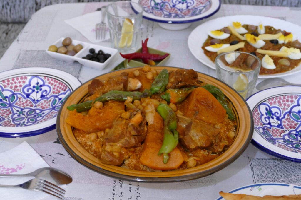The preparation follows the traditional method. Semolina is moistened with water and olive oil, rubbed into small grains, and steamed in a couscoussiers before being combined with the stew. The seasoning includes cumin, coriander, and turmeric.