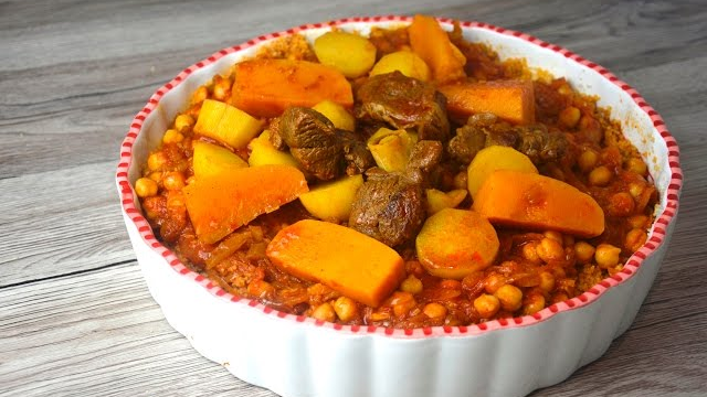 In Libya, Couscous is spicy and red in color, similar to the Tunisian version, made from a spiced tomato-based sauce with spices like cinnamon, turmeric, caraway, and hot red pepper. It is commonly made with lamb and fish. Chickpeas and vegetables like potatoes, carrots, pumpkin, and squash are often added.