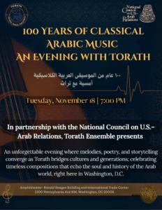Join the National Council after our conference proceedings for an unforgettable evening of classical Arab melodies, poetry, and storytelling with the acclaimed Torath Ensemble.
