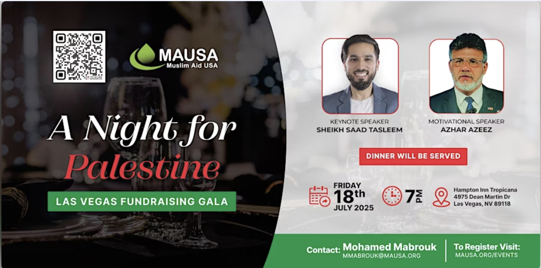 Join us for an inspiring evening in Las Vegas for humanitarian relief in Palestine. Your support will help provide life-saving aid — including food, clean water, and other essentials.