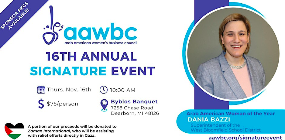 11 AM – 1 PM: Immerse yourself in our empowering event featuring our Arab American Woman of the Year, Dania Bazzi, for her outstanding contributions as the Superintendent of the West Bloomfield school district, our Executive Director and President recapping our initiatives in 2023 and announcing our upcoming plans for aawbc for 2024, and be part of our Scholarship Awardee recognition, celebrating the 10 Arab American students who will receive a $1,000 to further their education.