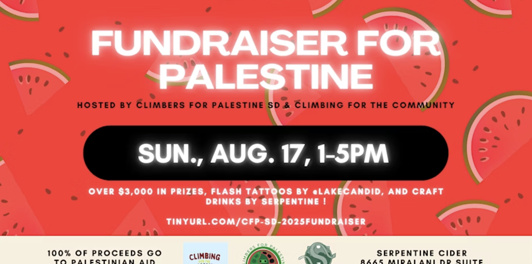 Climbers for Palestine San Diego is hosting a non-climbing fundraising event for Palestine to recap our 2025 ‘Climb The Wall’ fundraiser efforts. Come be in community, while raising awareness of and funds for the Palestinian cause. This event is welcome to ALL, not just climbers!