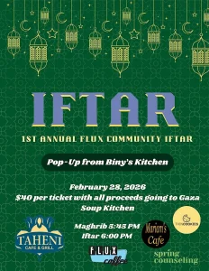 Join us for a fun community Iftar to break fast and share good vibes together! All proceeds going to Gaza Soup Kitchen. All are welcome!