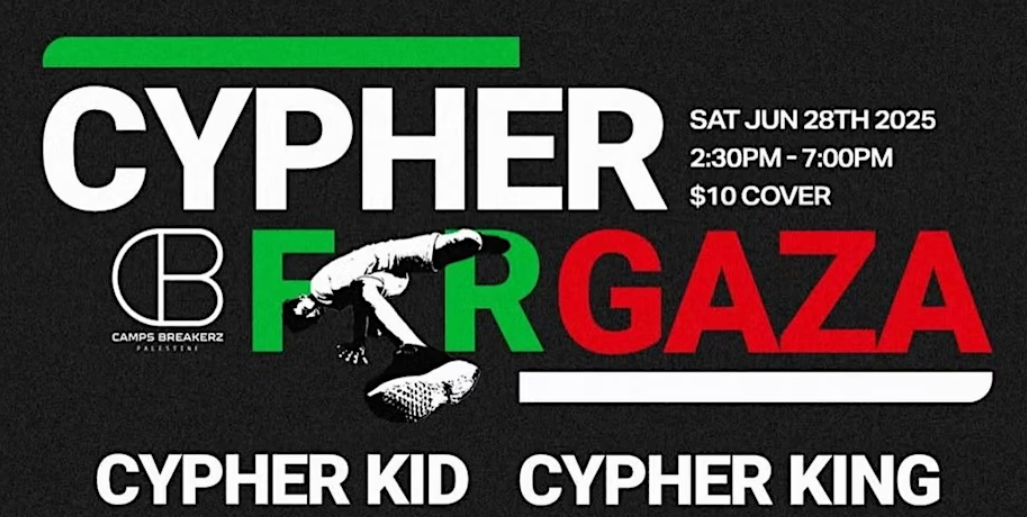 Join us for a powerful cypher to support youth in Gaza—breaking, art, and community care in solidarity and resistance.