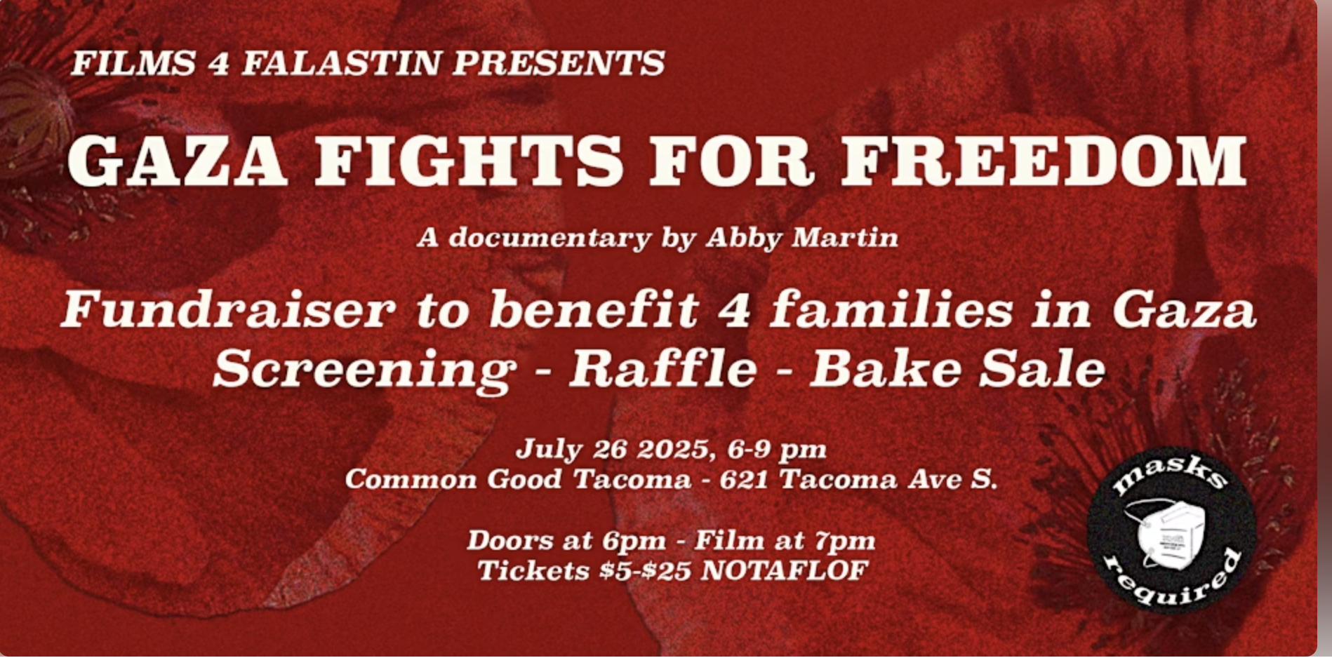 Join us Films 4 Falastin July 26th from 6-9PM at Common Good Tacoma, a local fundraiser raising money for 4 Families in Palestine.