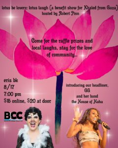Join host Robert “Bobbi” Pinn and our headliner, GG and her band the House of Haha, for an evening dedicated to laughter and uplifting others. They say laughter is the best medicine, and as a cancer survivor and founder of lotus be lovers, Bobbi knows just how healing it is to cope joyously. Let’s commune, cope, and cry tears of laughter together, all while raising money for Khaled, a cancer patient from Gaza. An evening of comedy, live-singing, raffle prizes, and community love awaits you.