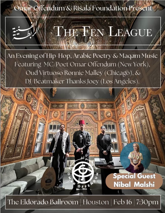 Risala Foundation invites you to an epic night – an evening of hip-hop, Arabic poetry, and maqam music with MC/Poet Omar Offendum, Oud virtuoso Ronnie Malley, and DJ/Beatmaker Thanks Joey, along with other special guests! This show has been playing to sold-out crowds across the US and we are thrilled to bring it to Houston. These creative voices have adroitly weaved a story that connects their rich Arab/Muslim/Immigrant stories to a contemporary audience. This event will take place at the historic El Dorado Ballroom.