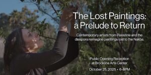 Join friends and supporters of the Brookline Arts Center for the Opening Reception of The Lost Paintings: A Prelude to Return, an exhibition gathering 53 artists from Palestine and its diaspora across time and borders to reimagine the missing works of Maroun Tomb, a Palestinian-Lebanese artist, whose 1947 exhibition in Haifa was lost amid the mass displacement and dispossession of the Palestinians during the Nakba.