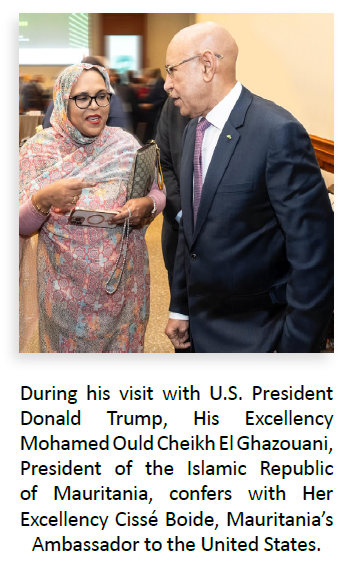 He went on to say, “Ambassador Cissé has played a pivotal role in fostering these relationships, championing Mauritania’s potential, and deepening mutual understanding. Her leadership has opened doors and inspired confidence on both sides.” He concluded, “As we look ahead, let today’s celebration also be a call to action . . . to reinvigorate trade, explore new agreements, and strengthen commercial ties that benefit both nations.”