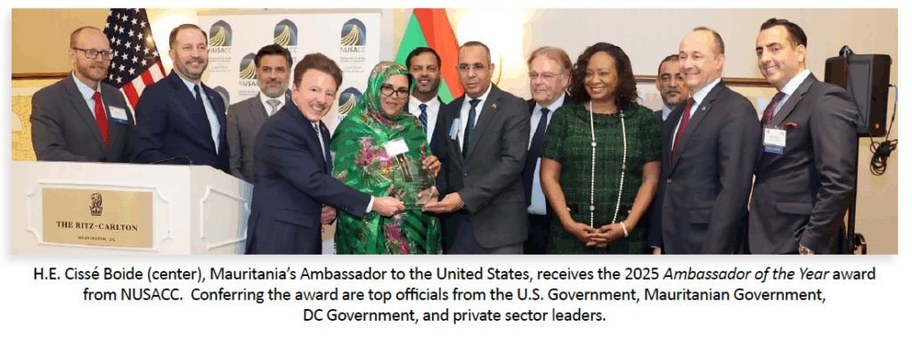 Ambassador Boide noted, “It is with deep gratitude and immense pride that I stand before you today as the 2025 Ambassador of the Year. I am truly honored by this recognition – bestowed by the National U.S.-Arab Chamber of Commerce – and I humbly accept this award on behalf of Mauritania’s leadership and our people.” (A video of the Ambassador’s acceptance speech may be found here.)