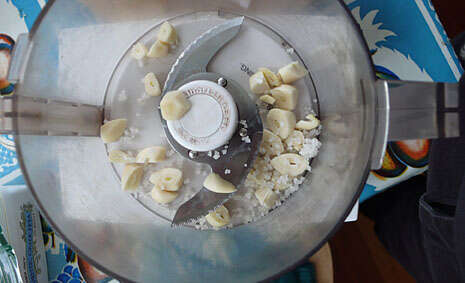 While they are on the stove top charring, i add chopped garlic and salt to the processor and pulse them together.