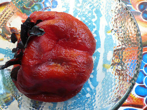 Starting out with fresh red peppers, just like the eggplant in baba ghannouj, these beauties get roasted right over the flame until the skin is blackened, which is a much quicker process than for the eggplants. Immediately they’re popped into a paper bag that is closed to retain the flavors and to slowly steam and cool.