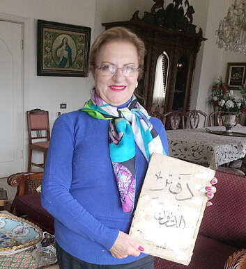 And this is how the day began. Mama soon joined in the singing in Arabic of the Lebanese national anthem, which she remembered from her childhood! At this point she had moved to sit beside the khouriyeh, now a reknown actress from Douma: Yvonne Maalouf Ganamey! While on our visit to Douma in 1998, mama’s first since she immigrated at the age of 16 in 1926, she remembered going to the cinema, which was all closed up and derelict seventy years later. But now that Yvonne and Douma have been featured in Nadine Labaki’s 2011 award winning and delightful film, Where Do We Go Now?, the Douma cinema has been restored and reopened with Nadine Labaki’s blessing! Much of the film was shot in Douma and Sitt Yvonne was a major star in the film. I took this photo of her in her home on my visit to Douma last year. She held a ledger that included my grandmother’s name as one of the first entries and was very gracious with me.