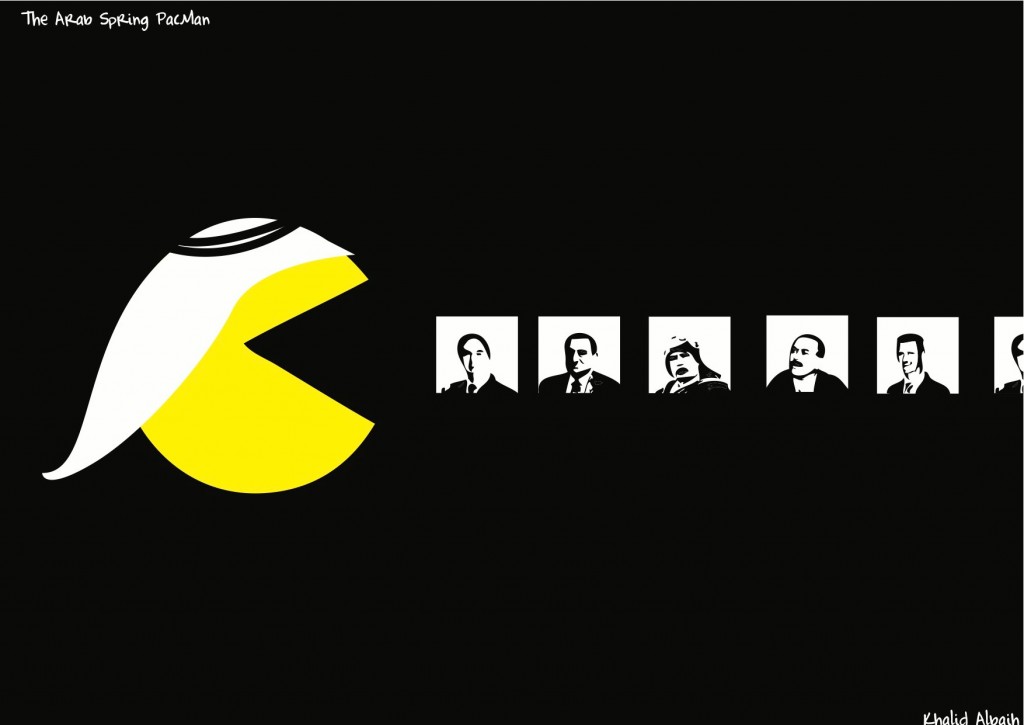 The “Arab Spring PacMan” depicts the fate of the following Arab dictators, left to right: Zine El Abidine Ben Ali (Tunisia), Hosni Mubarak (Egypt), Mummar Gaddafi (Libya), Ali Abdullah Saleh (Yemen) and Bashar al-Assad (Syria). Cartoon by Khalid Albaih