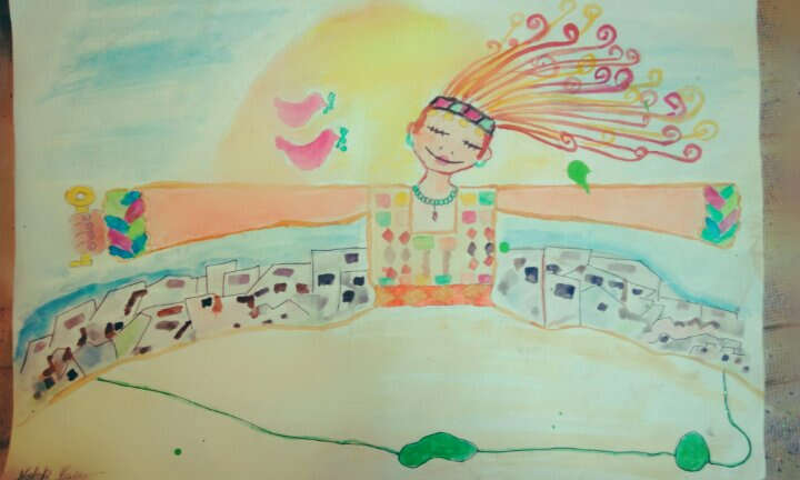 The watercolor above is one of Malak’s first, and she has progressed dramatically since then. When asked to describe what it means to her, she says: “It tells me about Malak. It shows the fear I felt, and when I look at it, I remember the sound of rockets. But it also shows hope despite the destruction. This picture makes me remember the strength I felt when I first held a [paint] brush.”