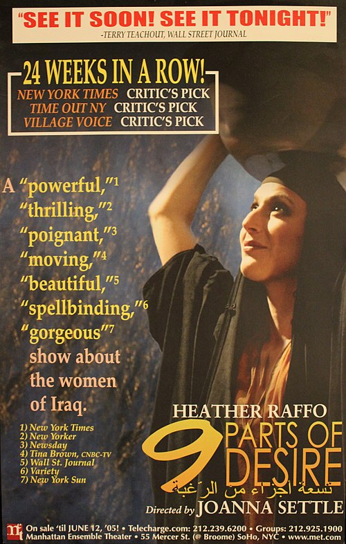 Raffo is perhaps most famous for her notable role in the one-woman play ‘9 Parts of Desire,’ her play that focuses on the lives of women in Iraq. Heather conceived of the play during one of several visits with Iraqi relatives. She attributed it also to a trip to the Saddam Art Centre in Baghdad, where she saw only billboard-sized portraits of Saddam Hussein, and in a back room at the Centre, a painting of a nude woman clinging to a barren tree. As Heather later noted about the painting, she took a photo of it, and on returning to the U.S., she “devised a way of replicating the painting into a play.” It was a decade later that she completed the play, which features monologues by nine highly distinct Iraqi women, all played by herself in some versions.