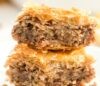 Repeat the filo layering again with another three sheets and remaining filling mixture. Top with the remaining three sheets and ensure your top layer uses up any remaining butter. Use a sharp knife to cut into diamonds, making sure the knife goes through every layer. We want every layer of filo to cook and crisp up.