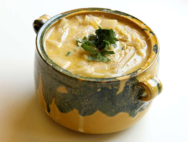 1 tsp ground cinnamon and 3 tbsp fresh parsley, to garnishHeat the oil and saute the onions, garlic, leeks and fennel for a few minutes. Add the potatoes, stock, cinnamon stick, lemon peel, allspice and bay leaves. Bring to the boil, then gently simmer for 20 minutes. Remove the cinnamon, lemon and bay, and season. In a separate bowl, whisk the egg yolks and cream, then stir in a large spoonful of soup. Whisk well, then tip into the soup. Slowly return the soup to just below boiling, stirring. Remove from the heat and adjust the seasoning with salt, pepper and lemon juice. Drizzle each bowl with oil and sprinkle with cinnamon and parsley.