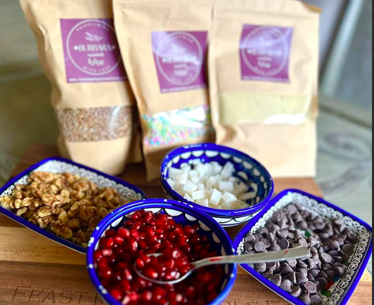 Warming spices like cinnamon, anise, and fennel are symbols of warmth and hospitality, yet provide a sweet herbal flavor. Raisins and coconut add a chewy sweetness. The colorful candy coated licorice candies, pomegranate, and walnuts add a burst of color and crunch. They also boost the antioxidants, and micronutrients in each bowl.