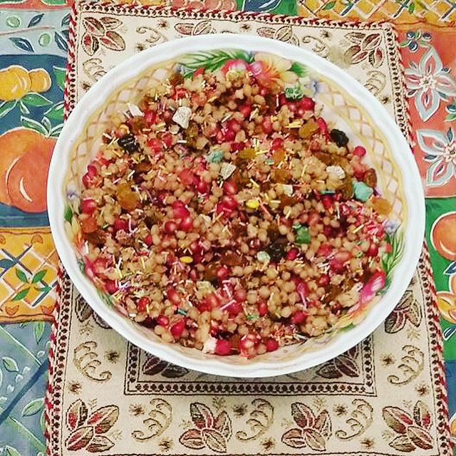 While Saint Barbara is honored across the Middle East, the connection between her feast and Palestinian Christians is especially deep. For nearly 2,000 years, Christian families in the Holy Land have commemorated her story with Santa Barbara’s feast. (“Eid el-Burbara”) This is celebrated with storytelling, dressing children in costumes, visiting neighbors, and most famously… sharing Burbara, a porridge made from wheat, chickpeas, anise, cinnamon, licorice candies, and pomegranate. As Palestinian families migrated, this tradition migrated with them, and today you can find this dish in Greece, Eastern European countries, and even South American countries like Chile.