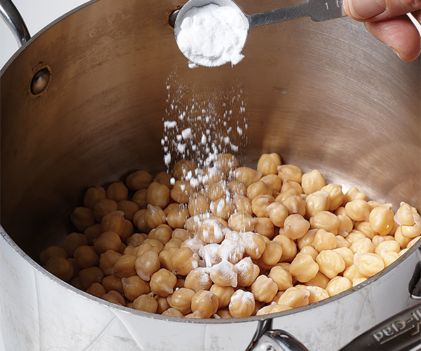 The baking soda also chemically reacts with the skins, beginning to dissolve them during the cooking process. Placing the cooked chickpeas in an ice bath as soon as they are done boiling will allow the skins to rise to the surface of the water, where they can be easily skimmed off before blending.