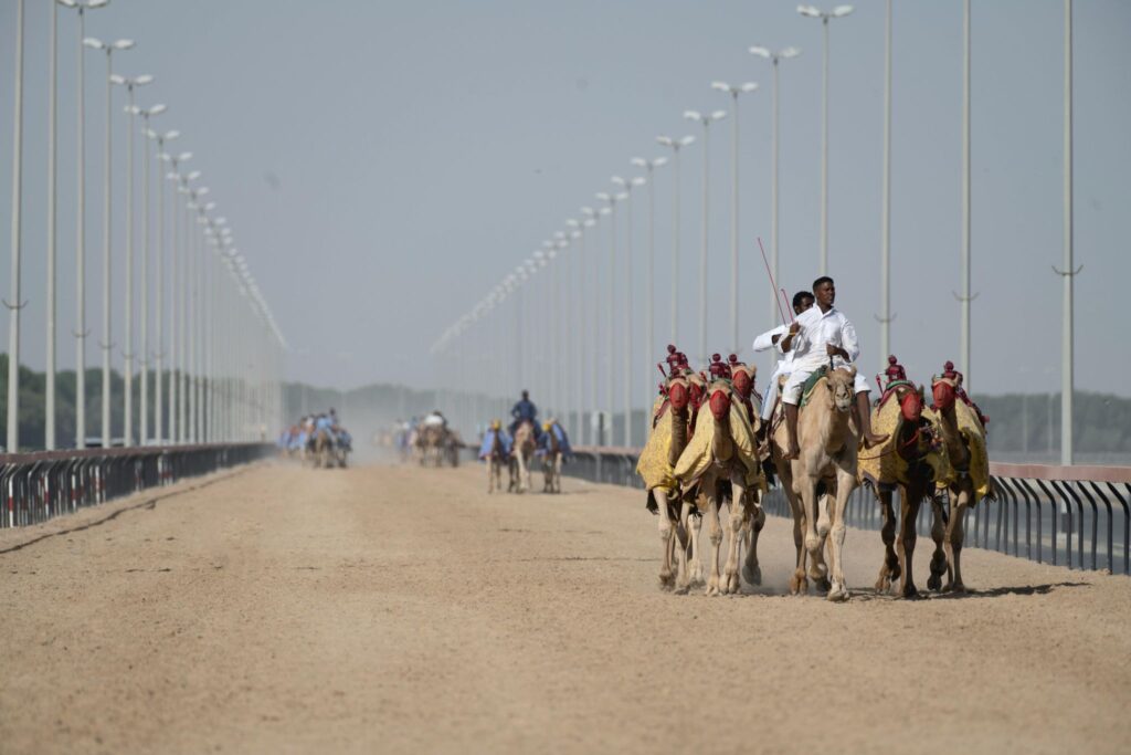 A camel race is a lively event. Tracks can stretch several kilometers, and races may last anywhere from a few minutes to half an hour, depending on the distance. Due to the heat, most camel races take place in the morning. At the beginning of a race, the camels are clustered together. When the gate lifts, they surge forward in a frenzy. Egged on by the honking of the many cars driving alongside them, they can reach up to 40 mph. Some race tracks also include grandstands for fans to watch, but many prefer to drive next to the trainers’ cars to watch the sport up close, adding to the excitement. Though most tournaments are much smaller, as recently as 2024, the largest camel racing tournament ever was held in Saudi Arabia with over 21,000 camels participating.