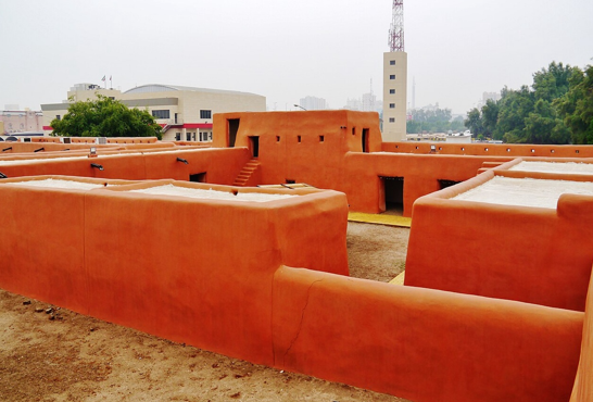 An example of this traditional construction can be seen in Al-Qasr al-Ahmar in Al Jahra, about 32 kilometers (20 miles) west of Kuwait City. Al-Qasr al-Ahmar showcases the elegance and efficiency of traditional techniques, with a central courtyard, decorated wooden doors, and well-ventilated rooms.
