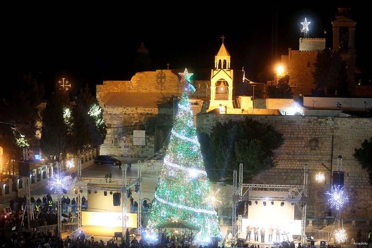 Hundreds of Palestinians and pilgrims gathered outside Bethlehem’s Church of Nativity on Saturday to attend the traditional lighting of a giant Christmas tree.The annual event takes place at the beginning of December in the West Bank town believed to be the birthplace of Jesus. It marks the start of holiday festivities, during which thousands of pilgrims flock to Bethlehem.