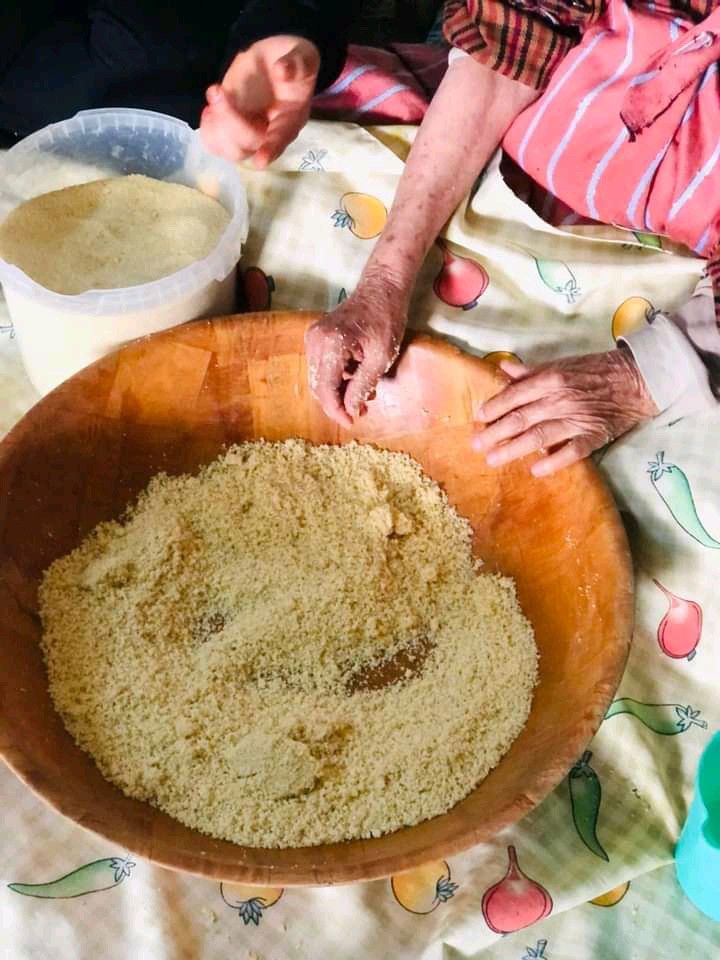 Food plays a central role in Libyan Amazigh families. Many prepare tamoqtal, also known as Ellousa (اللوسة), a food passed down from generations. Families make Ellousa by drying onions, tomatoes, peppers, and garlic, then cooking and blending them with olive oil. Its preparation reflects a deep connection to the land, relying on sun-drying and seasonal ingredients from the mountains.