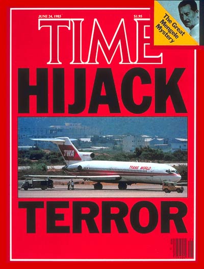 Hijacking of TWA flight 847, 1985: A flight from Athens to Rome was hijacked by Hezbollah operatives. U.S. Navy diver Robert Stethem was murdered and dozens of other passengers were held hostage for about two weeks.